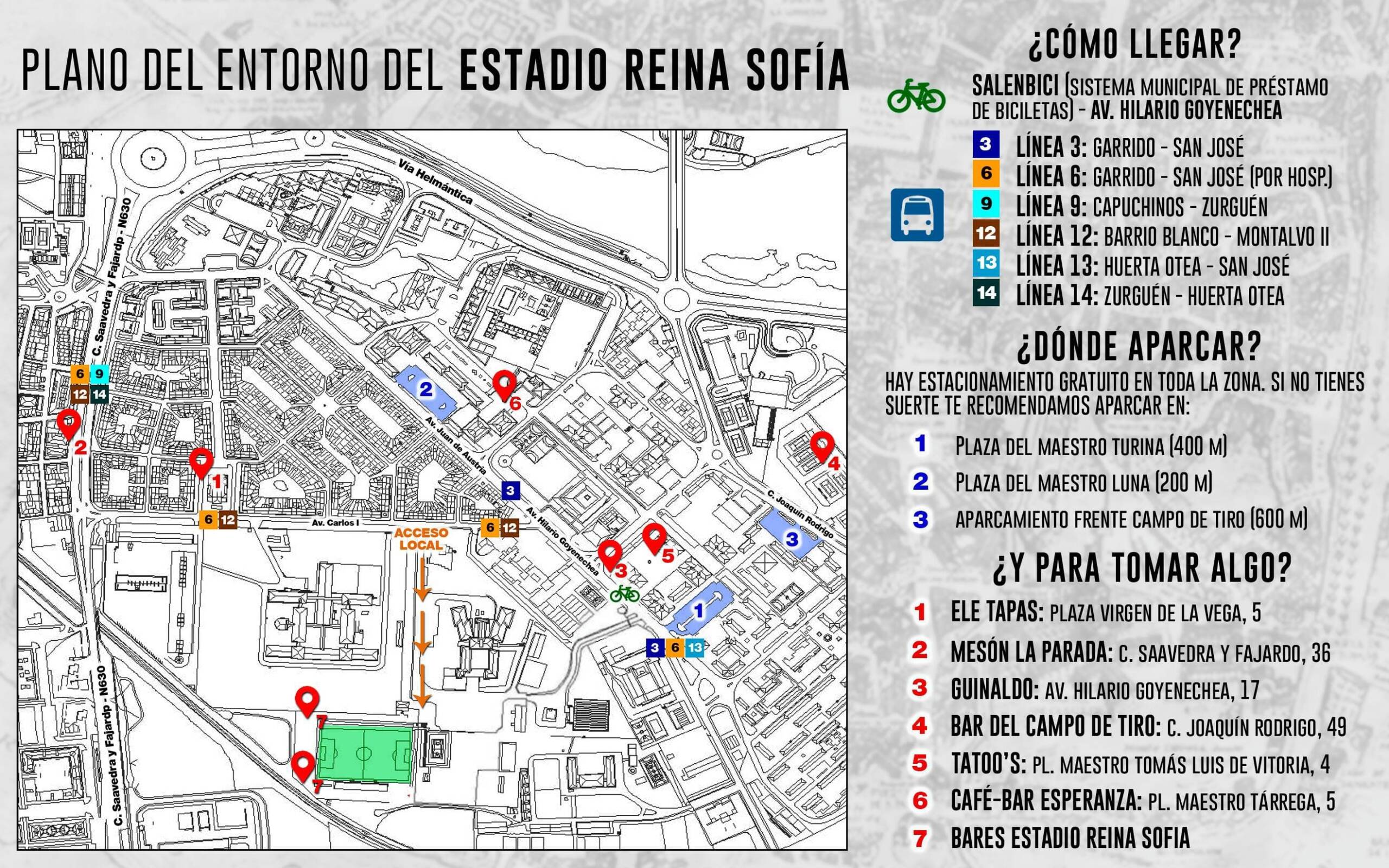 Aconsejamos es a ser posible evitar el vehículo privado y usar el transporte público. El estadio está muy bien comunicado con la ciudad. Las líneas de bus urbano 3,6,9,12,13 y 14 tienen paradas muy cerca del estadio, como se puede observar en la imagen de más abajo. Otra buena opción es utilizar el servicio Salenbici, que tiene una parada en Avenida Hilario Goyenechea, a muy pocos metros del Reina Sofía.