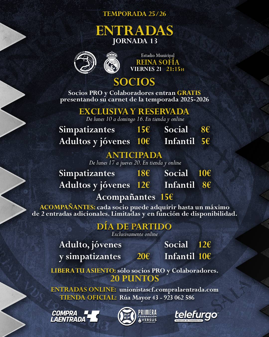 La venta a socios el día de partido será exclusivamente online en este enlace: (clic aquí) No habrá venta en taquilla.