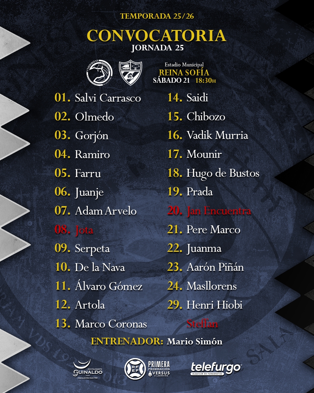 Son baja Steffan, Jota y Jan Encuentra por lesión. Las novedades en la lista son los regresos de Ramiro y De la Nava tras cumplir sus respectivas sanciones y de Olmedo. También entra el futbolista con ficha del filial Henri Hiobi.