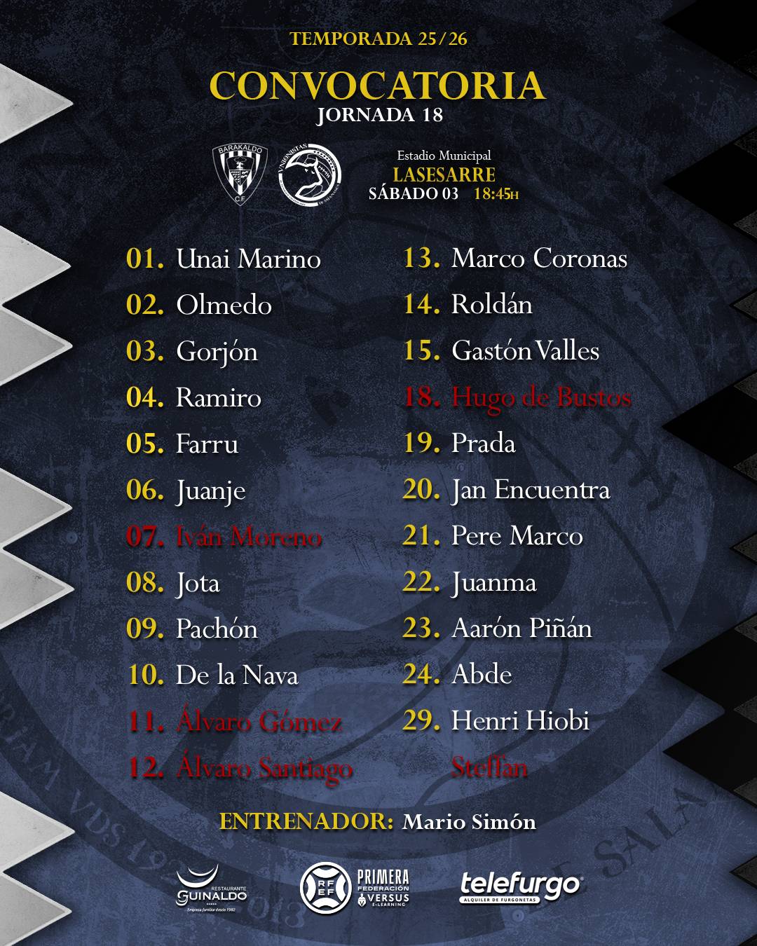 Son baja Steffan y Hugo de Bustos por lesión, Álvaro Gómez por acumulación de amonestaciones y Álvaro Santiago e Iván Moreno por decisión técnica. La principal novedad es la presencia de Henri Hiobi, reciente incorporación con ficha del filial.
