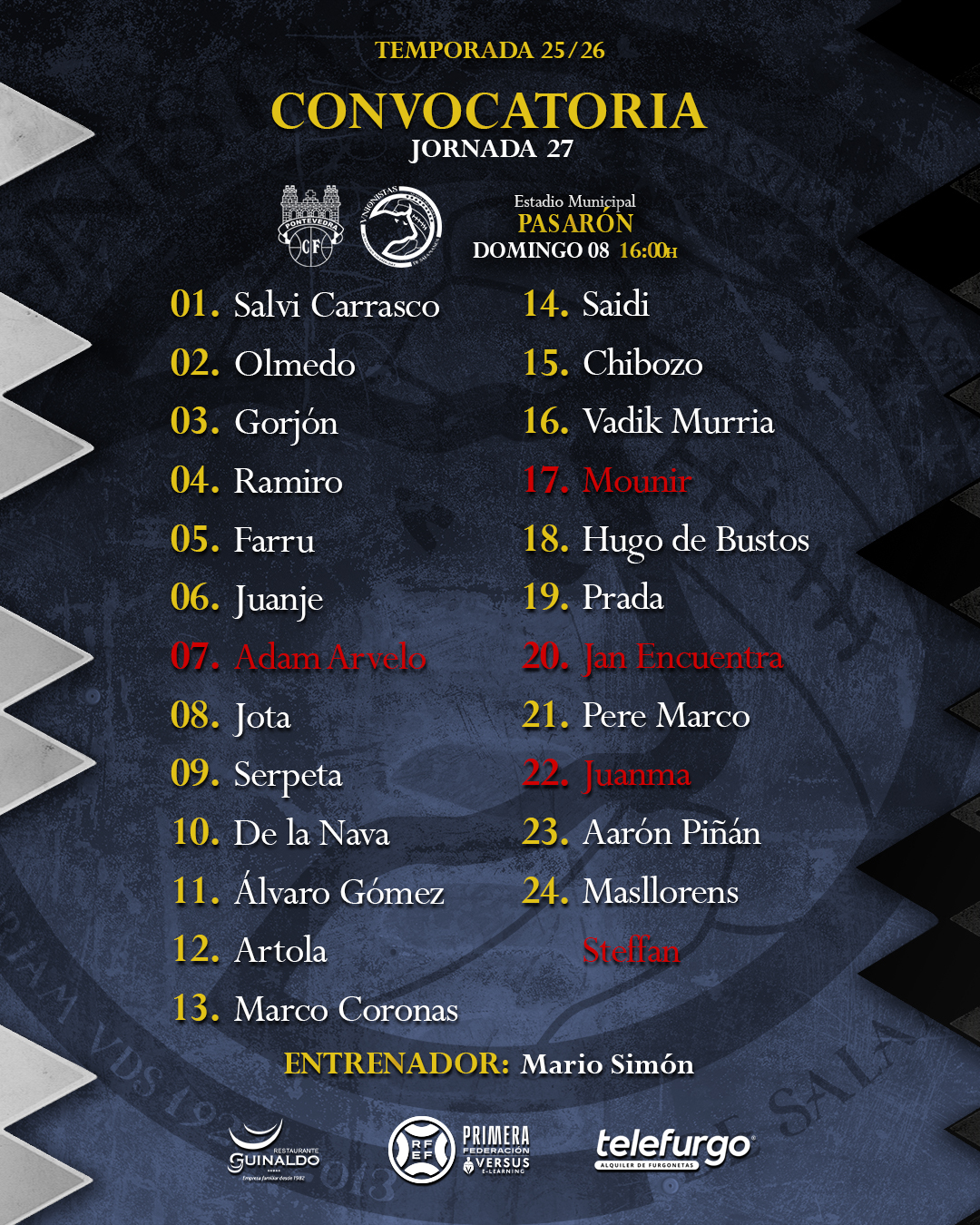 El técnico del primer equipo, Mario Simón, ha convocado a 20 futbolistas para el compromiso liguero ante el Pontevedra Club de Fútbol que se disputará el domingo 8 de marzo a partir de las 16.00 horas en el Estadio Municipal de Pasarón.