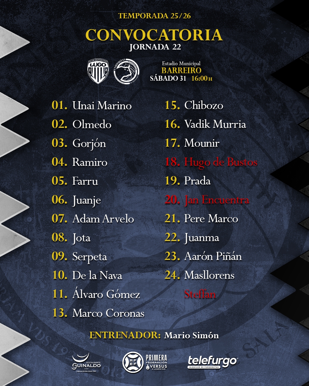 Son baja Steffan, Jan Encuentra y Hugo de Bustos por lesión. Las principales novedades son la presencia de las últimas incorporaciones: Masllorens, Serpeta y Chibozo. Este último ha podido ser inscrito hoy mismo tras superar todos los trámites burocráticos.