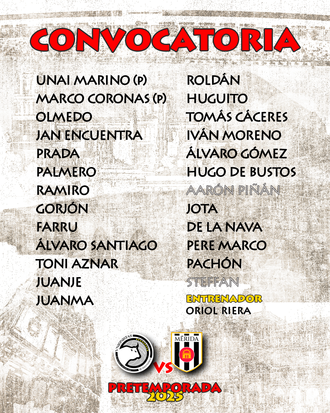 El entrenador del primer equipo de Unionistas de Salamanca, Oriol Riera, ha convocado a todos sus jugadores disponibles. En la relación figuran también los canteranos Huguito, Tomás Cáceres y Toni Aznar, a los que se ha unido a última hora Fon. Además la lista cuenta con la novedad de la última incorporación, Roldán